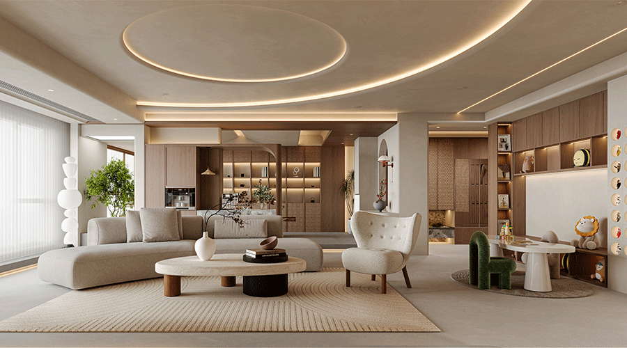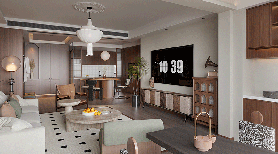 新中式風(fēng)格以“傳承與創(chuàng )新”為核心,設計上通過(guò)天然大理石、藝術(shù)涂料及大板墻地磚的現代材質(zhì)重構東方美學(xué)。天然大理石的山水紋理成為空間視覺(jué)焦點(diǎn),以整面背景墻或地面鋪貼的形式,呼應傳統水墨意境;藝術(shù)涂料通過(guò)手工肌理與素雅色調,為墻面賦予宣紙般的質(zhì)樸感,結合淺木色木作平衡冷暖;大板墻地磚則以極簡(jiǎn)無(wú)縫的鋪貼工藝,營(yíng)造開(kāi)闊通透的空間基底,局部嵌入金屬線(xiàn)條、格柵屏風(fēng),凸顯傳統榫卯結構的現代演繹。材質(zhì)碰撞中,既有石材的厚重底蘊,亦通過(guò)啞光質(zhì)感與低飽和色彩弱化傳統中式的繁復感,搭配明清形制簡(jiǎn)化的家具與枯山水擺件,最終達成“簡(jiǎn)于形,奢于質(zhì)”的禪意棲居體驗,實(shí)現傳統文人精神與現代生活需求的共生。