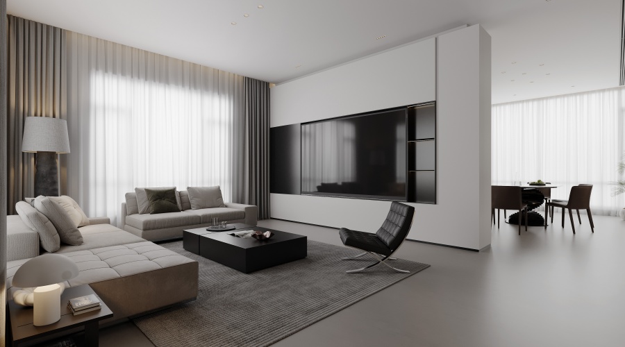 整體以黑白灰等低飽和度色調為主,營(yíng)造出簡(jiǎn)潔、靜謐的氛圍,如客廳的黑色皮質(zhì)沙發(fā)與淺色墻面、地面形成鮮明對比,卻又和諧統一??臻g布局上,追求開(kāi)闊與通透,開(kāi)放式的餐廚區域與客廳相連,增強了空間的互動(dòng)性與延展性,讓光線(xiàn)能更自由地穿梭,提升了整體的明亮感。